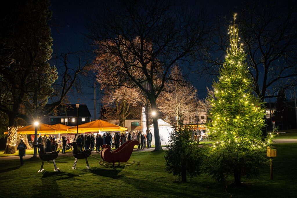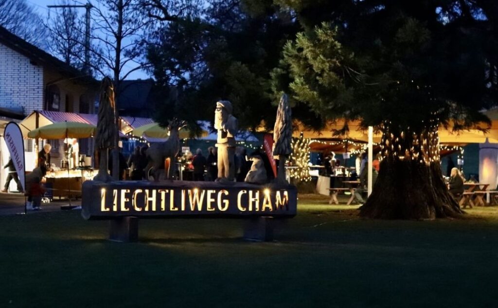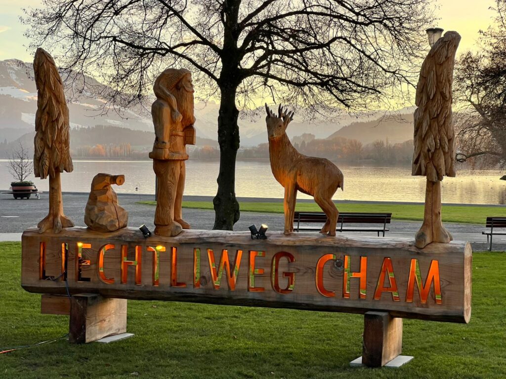 Stimmungsvoll war der Heimweg, welcher viele Gäste durch die wie Glühwürmchen leuchtenden Wege an verschiedenen Holzobjekten und dem Schlitten mit Renntieren vorbeiführte. Ein Spaziergang durch den grossen Chamer-Seepark lohnt sich bei jeder Wetterstimmung.