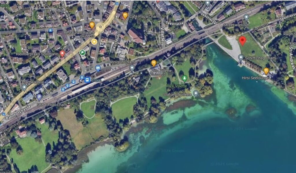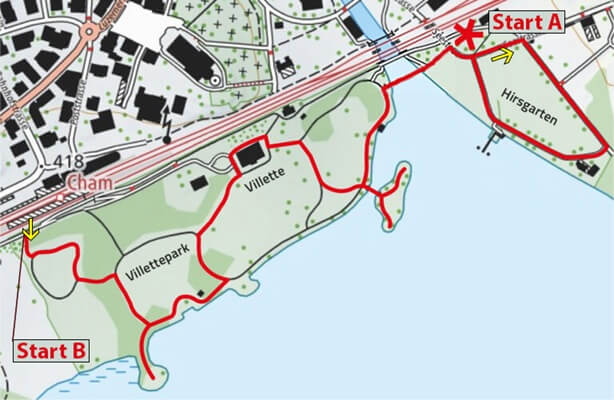 Ein Ausgangspunkt des «Chomer Liechtliweges» befindet sich beim «Brunchplatz»* im Hirsgarten. Von hier führt der Weg um die Hirsgartenwiese herum und bei der Badi Hirsgarten vorbei. Über die Brücke geht’s weiter in den Villettepark zum Inseli und hinter dem Restaurant Villette durch wieder hinunter zum See, am «Badhüsli» vorbei zum Rondell und über den neusten Teil des Parkes hinaus auf den Fahrweg Richtung Bahnhof.